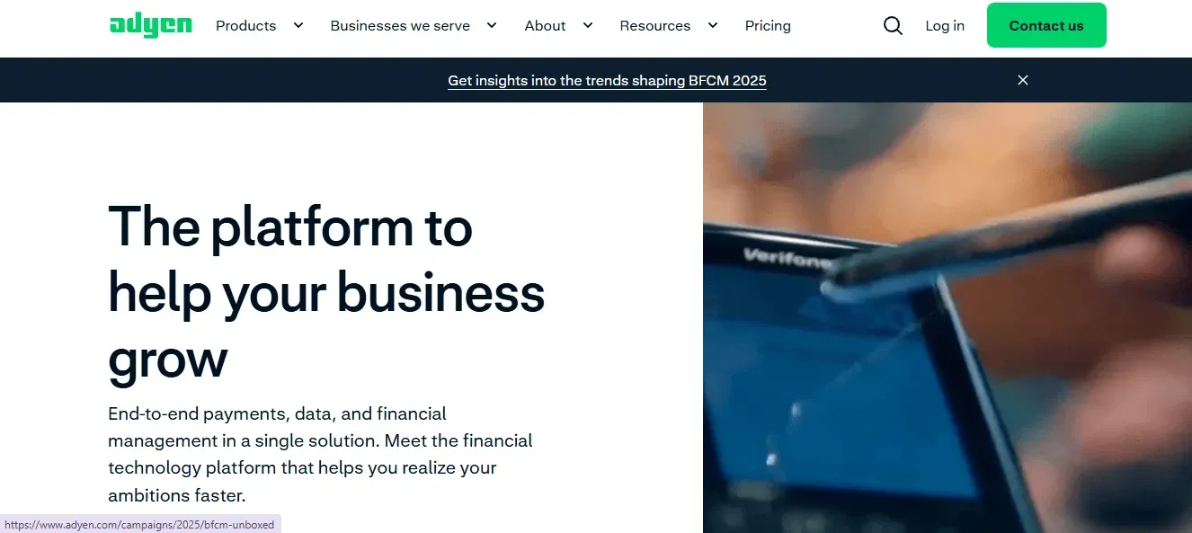 For example, you can use Adyen to make card payments or local methods on your website, and even in-person transactions via terminals. it’s a unified payments platform that handles checkout, fraud checks, and merchant accounts for you.