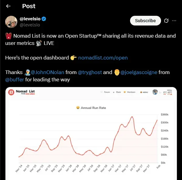 Narrating your journey on social platforms like Twitter, LinkedIn, and Discord, you can invite your audience to invest emotionally in your vision. Indie Hackers member Pieter Levels, who has shared Nomad List’s traffic and revenue data publicly since 2014, credits this openness with growing and securing loyal early adopters.