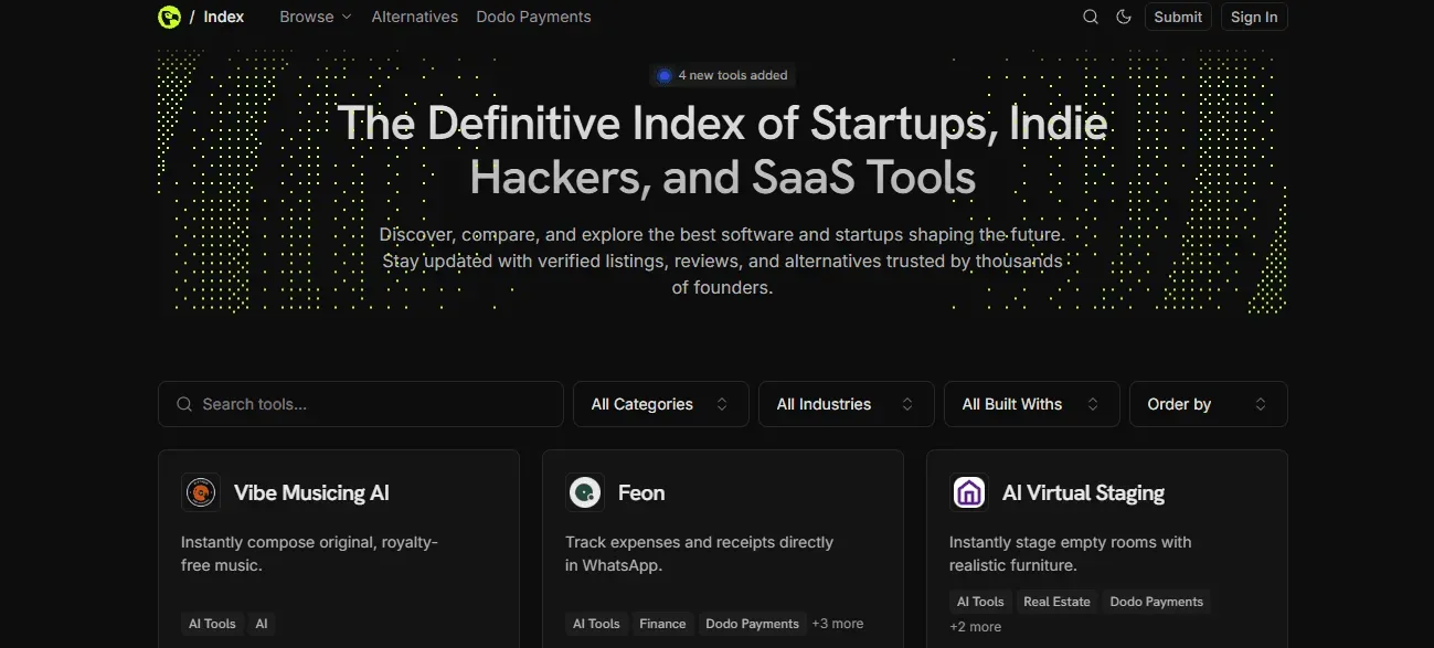 Index by Dodo Payments: a discovery tool helping developers find the SDKs, adapters, and community guidance they need.