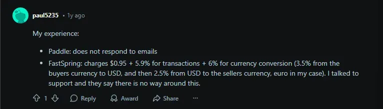 Outdated Dashboard: Some reviewers find FastSpring’s admin interface clunky or dated.