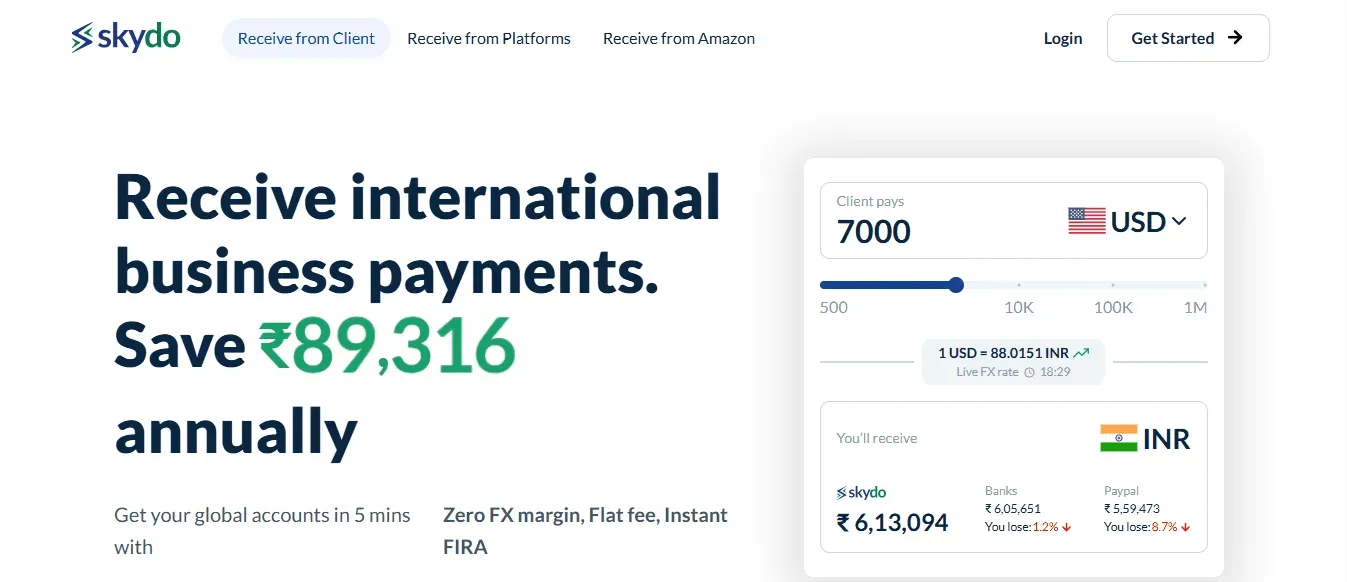 Skydo is a payments service focused on Indian businesses receiving international B2B payments. It offers local virtual accounts in major currencies so overseas customers can pay via local transfers while businesses receive INR, often at competitive FX rates and with simplified compliance documentation.