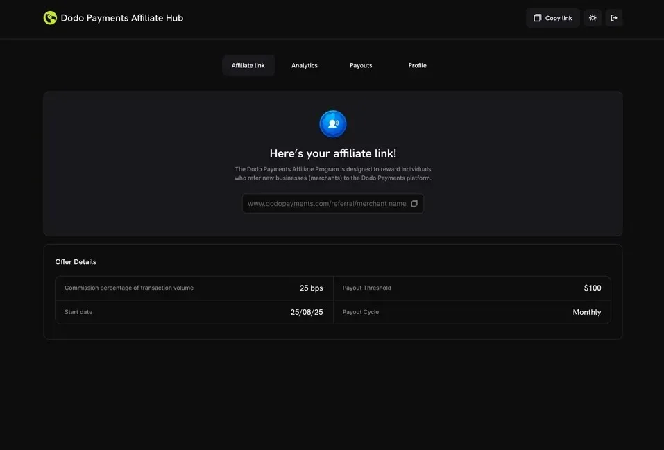 For example, Partners can sign up in the Affiliate Partner Program, get a referral link, and start sharing it across content and communities. Whenever a referral starts monetising through Dodo Payments, the partner earns ongoing monthly commissions.